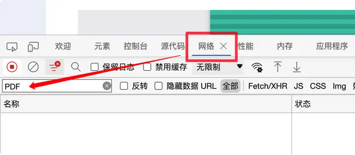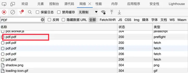 下面网络面板中有很多请求,找到pdf.pdf第一个。